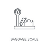 Zdjęcie "ikonę wektora skali bagażu. na białym tle Prosta ilustracja element linii z terminala lotniska koncepcji. na białym tle ikona skali bagażu wektor skok" może być wykorzystywane do celów osobistych i komercyjnych zgodnie z warunkami zakupionej licencji Royalty-free. Obraz jest dostępny do pobrania w jakości wysokiej rozdzielczości do 5760x3840.