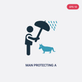 zarys człowieka ochrony psa z ikoną wektor parasol. na białym tle prosty element linii ilustracji od ludzi koncepcji. edytowalny wektor skok człowiek chroniąc psa z ikoną parasola na