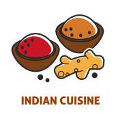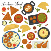 Indie żywności kuchnia indyjska mięso i pieczywo produkty wektor curry kurczaka podudzia i smażone jaja śniadanie Samosa i zupa pączki i Paneer ser chili sosy Jalebi danie potraw narodowych i flagi.