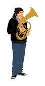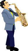 Ilustracja wektorowa odtwarzacza saksofonu. Muzyka człowiek grać instrument wiatr. Artysta muzyczny. Człowiek jazzowy. Wykonawca ulicy bugler. Muzyk grać trąbka. Rozrywka dla publiczności. Klasyczne wydarzenie muzyczne.