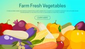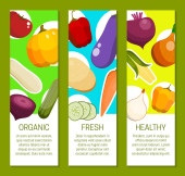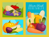 Zestaw warzyw banerów, kartek wektorowych ilustracji. Rynek gospodarstw rolnych. Produkty wegetariańskie, naturalne i ekologiczne. Zdrowy styl życia ze świeżą żywnością. Zawiera bakłażan, pomidor, kukurydza.