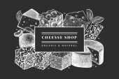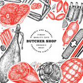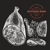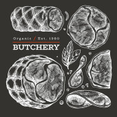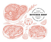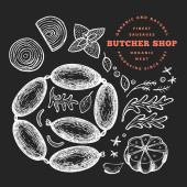 Vintage wektor mięso ilustracja na pokładzie kreda. Ręcznie rysowane stek zestaw, przyprawy i zioła. Surowe składniki żywności. Retro szkic. Może być używany do etykiet, menu restauracji.