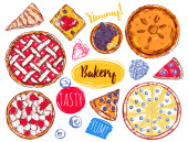 Piekarni menu ilustracji wektor. Czekoladowe i owocowe desery do słodkiej cukierni z babeczki, ciasta piekarnicze, pudding jagodowy, ciastka, bita śmietana, beries glazury