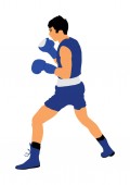 Bokser w pierścieniu wektor ilustracja na białym tle. Silny myśliwiec. Rzut bezpośredni. Sportowcem szkolenia. Oszczędzające. Demonstracja umiejętności walki. Boks sportowy spektakl wydarzenie. Kick avodiance