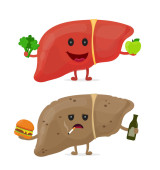 Zdrowe i niezdrowe postacie z kreskówek wątroby na białym tle. Wesoła wątroba z zdrowej wegetariańskiej żywności i chorych wątroby gospodarstwa złe produkty dla jego zdrowia, z marskością wątroby. Ilustracja medyczna.