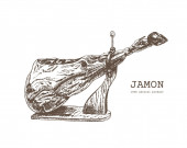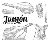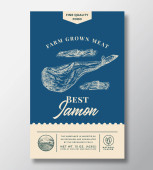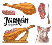 Vintage Jamon. Szkicu. Świetnie nadaje się na rynek, restauracja, kawiarnia z grillem, projektowanie etykiet spożywczych.