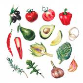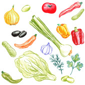 Zestaw świeżych, ręcznie rysowanych warzyw. Akwarela rysunek zdrowej żywności. Obraz chili i papryki, cebuli, rzodkiewki i brukselka i inne warzywa.