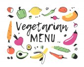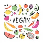 Ręcznie rysowane zestaw warzyw, owoców i przyjaznych dla środowiska słów. Vec