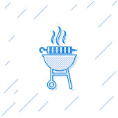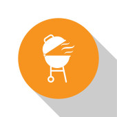 Biały grill grillowany shish kebab na szpikulec trzymać ikonę izolowane na białym tle. Mięsny kebab z grilla na szpikulcu. Piknik z mięsem z grilla. Pomarańczowy. Ilustracja wektora
