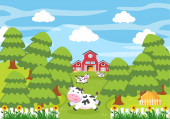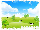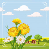 Świeży wiosenny krajobraz, gospodarstwo rolne, krowy, pola, łąki, stokrotki i mniszek lekarski, trawa, powitanie, odosobniony, cartoon style, wektor ilustracji
