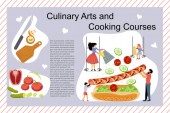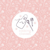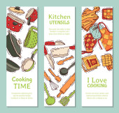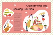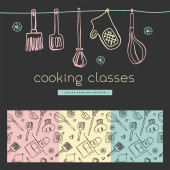 Lekcje gotowania sprzętu banner naczynia kuchenne lub naczynia do jedzenia z naczyniami naczynia kuchenne i ilustracji płyty. Naczynia i patelnia lub pot househol kulinarne szkoły. Urządzenie do domu.