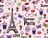 Lato Paryż z wieży Eiffla, Motyl. Wektor bez szwu wzór. Śliczne kobiece różowe tło.