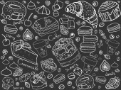 Ilustracja wektorowa na czarnym tle ze śniadaniem, kawą, pizzą, przekąskami. Przydatne do pakowania, projektowania menu i dekoracji wnętrz. Ręcznie rysowane Doodles. Szkicowy zbiór elementów żywności. Deska kreda.