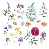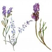Tropikalny i ogród letni bukiet z ziół, liści i egzotycznych kwiatów. Kompozycja fioletowe kwiaty na białym tle.