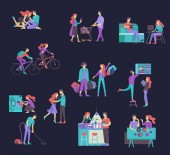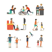 Kolekcja rodzinnych hobby i zajęć. Matka, ojciec i dzieci bawią się z kotami, zbierają śmieci do recyklingu, przylegając do domu, relaksując się z gadżety w domu. Kreskówka wektor