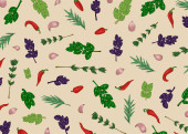 Zdjęcie "Bezszwowy wzór przypraw jak papryka i chili, orzech i gałka muszkatołowa, liść laurowy i sezam, anyżu i nasion. Ilustracja wektorowa rysowane ręcznie" może być wykorzystywane do celów osobistych i komercyjnych zgodnie z warunkami zakupionej licencji Royalty-free. Obraz jest dostępny do pobrania w jakości wysokiej rozdzielczości do 5760x3840.