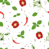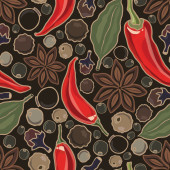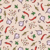 Bezszwowy wzór przypraw jak papryka i chili, orzech i gałka muszkatołowa, liść laurowy i sezam, anyżu i nasion. Ilustracja wektorowa rysowane ręcznie