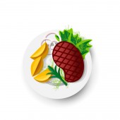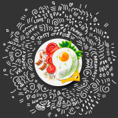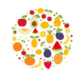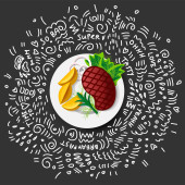 Zdrowy styl życia z sportu i zdrowych Doodles dieta i ikony-Sport, jedzenie, szczęśliwe i normalne ikony snu wokół świeżych, soczystych owoców na białym tle. Healty dieta i koncepcja sportu