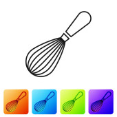 Czarna kuchnia ikona kadzi na białym tle. Naczynia do gotowania. Sztućce łyżka znak. Ustaw ikonę w kolorowych kwadratowych przyciskach. Ilustracja wektorowa