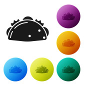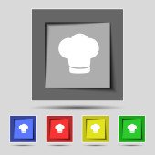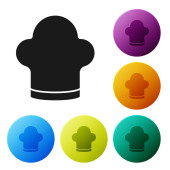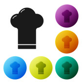 Czarny szef kuchni ikona kapelusz na białym tle. Symbol gotowania. Kapelusz kucharzy. Ustaw ikonę w kolorowych kwadratowych przyciskach. Ilustracja wektorowa