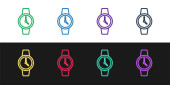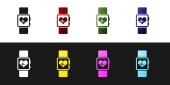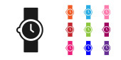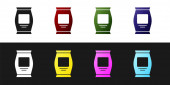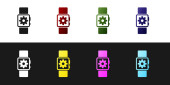 Zestaw SmartWatch z śrubokręt i klucz ikona izolowane na czarno-białym tle. Regulacja, serwis, ustawienie, konserwacja, naprawa, mocowanie. Ilustracja wektorowa