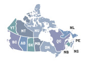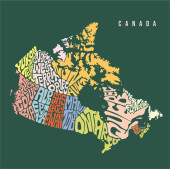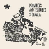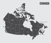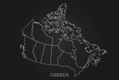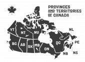 Mapa Kanady. Plakat Mapa prowincji i terytoriów Kanady. Czarno-biała Mapa Kanady dla t-shirtu, plakatu lub motywów geograficznych. Ręcznie rysowana czarna mapa z prowincjami. Ilustracja wektorowa