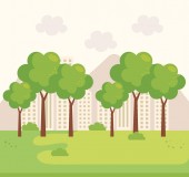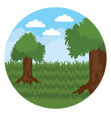 Ilustracja kreskówka dla dzieci. Płaski Las wiosenny z kwitnącymi drzewami