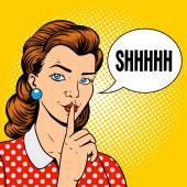 Komiks styl piękna młoda kobieta trzyma palec na ustach,