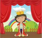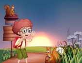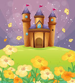 chłopiec, wskazując w pobliżu kwiaty w wzgórza z zamkiem