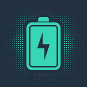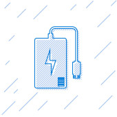 Zielony Bank energii z inną ikoną przewodu ładowania na niebieskim tle. Przenośne urządzenie ładujące. Długi styl cienia. Ilustracja wektorowa