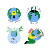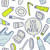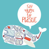Bezużyteczny plastik. Ilustracja ekologiczna. Problem zanieczyszczenia tworzyw sztucznych. Ilustracja wektorowa z napisami.