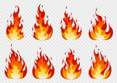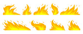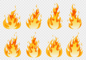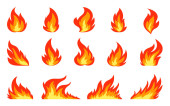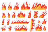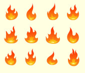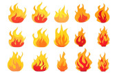 Zestaw ikona ognia ogień w kreskówek i płaski styl. Obiekt izolowany w różnych formach.