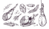 Stek. Vintage szkic z wołowiny i wieprzowiny kotlety żebra i filet, wyroby spożywcze z czosnkiem i pieprzem. Wektor zestaw zaokrąglania