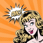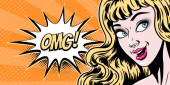 Komiks styl piękna młoda kobieta rozmawia na telefon komórkowy, wyraz zaskoczony, otwarte usta, pop art Girl banner, wektor ilustracji