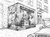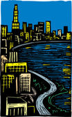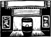 drzeworyt ilustracja człowieka sukcesu w biznesie w biurze z widokiem