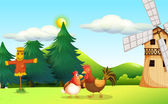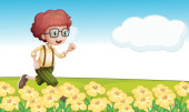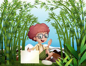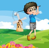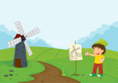 szczęśliwym chłopcem w pobliżu szyld drewniany wiatrak