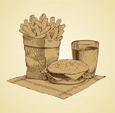 Szczegółowa ilustracja fast food w stylu vintage. wyciągnąć rękę. na białym tle obiekt na żółtym tle.