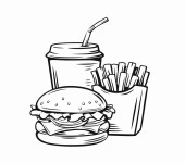 Szczegółowa ilustracja fast food w stylu vintage. wyciągnąć rękę. na białym tle obiekt na żółtym tle.
