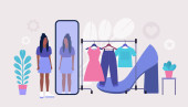 Zdjęcie "Młoda kobieta próbuje na buty siedzi na kanapie w pobliżu półki z Footgear w sklepie. Młode dziewczyny wybierają i dopasowują obuwie w Market lub Mall. Zakupy czas wolny kreskówka rysunek wektor" może być wykorzystywane do celów osobistych i komercyjnych zgodnie z warunkami zakupionej licencji Royalty-free. Obraz jest dostępny do pobrania w jakości wysokiej rozdzielczości do 5760x3840.
