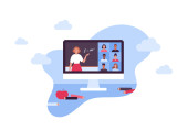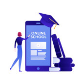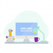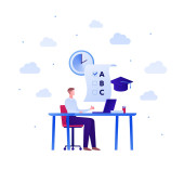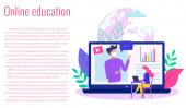 Vector nowoczesnej płaskiej ilustracji edukacji. Kobieta i laptop ze stroną szkoły online. Książka, pióro, symbol chmury. Koncepcja uczenia się online, Uniwersytet, kursy. Projektowanie plakatów, ulotek, kart, banerów
