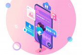 Koncepcja izometryczna link phishing, kradzież danych z aplikacji mobilnej, dane karty kredytowej i hasła użytkownika, Dziewczyna w szoku. Koncepcja projektowania stron internetowych