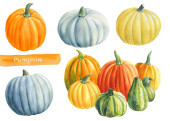 Zdjęcie "Kolekcja czerwonych pomarańczowych jesiennych dyń. Jesienne żniwa. Zestaw zapasów wektorowych. Śliczne bajki z akwarelą tekstury. Halloween, Dziękczynienia. Tło żywnościowe. Ręcznie rysowane elementy konstrukcyjne. " może być wykorzystywane do celów osobistych i komercyjnych zgodnie z warunkami zakupionej licencji Royalty-free. Obraz jest dostępny do pobrania w jakości wysokiej rozdzielczości do 5760x3840.