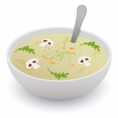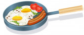 Rysowanie wektorowe. Koncepcja śniadaniowa, smażone jajko z kiełbasą, rukolą i warzywa.