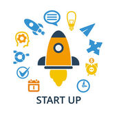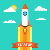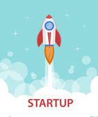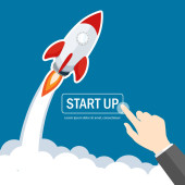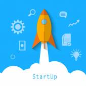 Rozpocznij koncepcję z rakietą startów. Wektor ilustracji w kreskówkowy płaski styl na białym tle. Uruchamiania