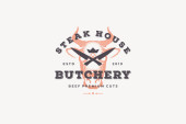 Ręcznie rysowane logo mięso stek sylwetka i nowoczesne vintage typografia retro styl wektor ilustracja.