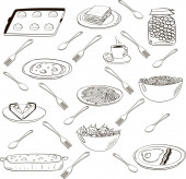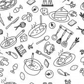 Ręcznie rysowane jesienne wakacje ilustracja. Tusz twórczy. Prawdziwy rysunek wektora. Dzień Dziękczynienia płynny wzór z jedzeniem, napojami, rzeczami