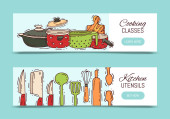 Przybory kuchenne i narzędzia okrągłe wektor ilustracji wzór. Naczynia do gotowania, szkło, porcelana i emalia umieszczone wokół miejsca na tekst.