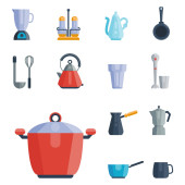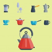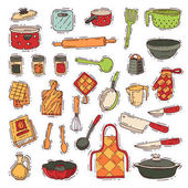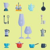 Narzędzia kuchenne na półkach wektor ilustracji. Półka drewniana z przyborami kuchennymi do gotowania. Szkło, porcelana i emalia