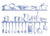 Zdjęcie "Narzędzia kuchenne na półkach wektor ilustracji. Półka drewniana z przyborami kuchennymi do gotowania. Szkło, porcelana i emalia" może być wykorzystywane do celów osobistych i komercyjnych zgodnie z warunkami zakupionej licencji Royalty-free. Obraz jest dostępny do pobrania w jakości wysokiej rozdzielczości do 5760x3840.