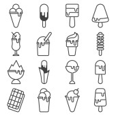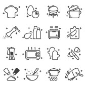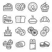 Ikony piekarni. Zestaw zawiera różnorodne wyroby cukiernicze, a także metody i środki ich przygotowania i sprzedaży. Wektor na białym tle.